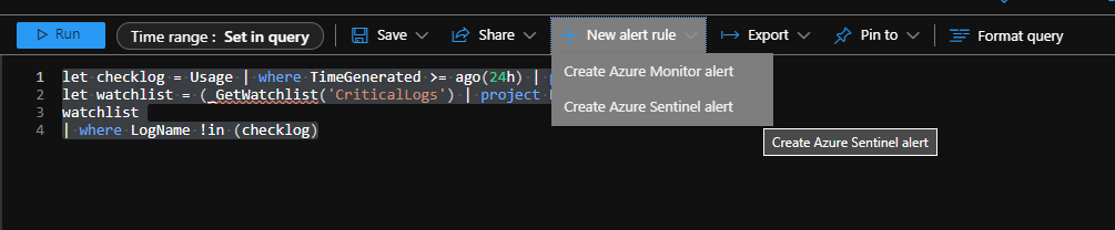 From the query, Create Azure Sentinel alert