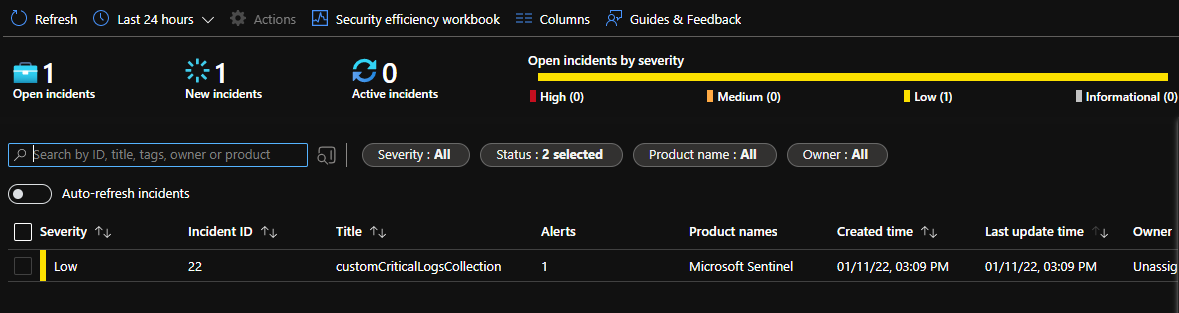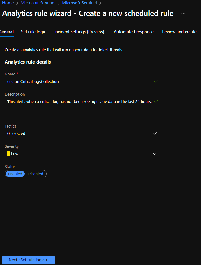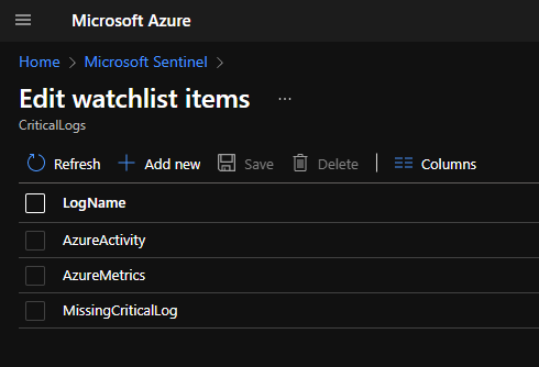 I will not get into the details of Watchlist creation in this blog. Please check out Use Watchlists in Microsoft Sentinel for more information. I created a simple .csv file with three log names: AzureActivity, AzureMetrics, and MissingCriticalLog. I then created the list from that .csv