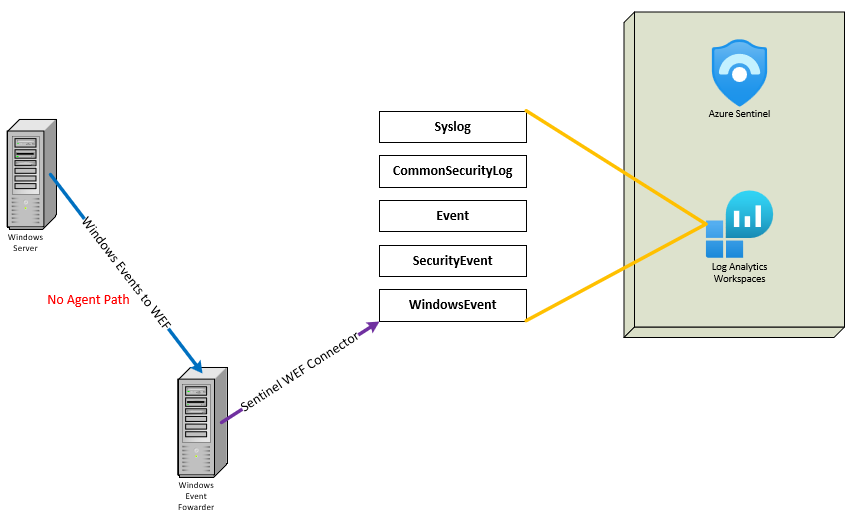 Just as with the Syslog forwarder scenario, there might be situations where installing the Azure ARC agent with the AMA extension on every Windows device isn't ideal. In these instances, Windows Event Forwarding is a viable alternative. This feature, integrated into modern Windows operating systems, enables your systems to send Windows Events to a centralized collector. This collector then forwards the events to the Log Analytics Workspace, utilizing the Azure ARC agent and the AMA extension. You'll use the "Windows Forwarded Event" connector in Microsoft Sentinel to set up this data collection. All data transmissions are securely handled. When you use Windows Event Forwarding, the collected Windows Events are stored in the table.