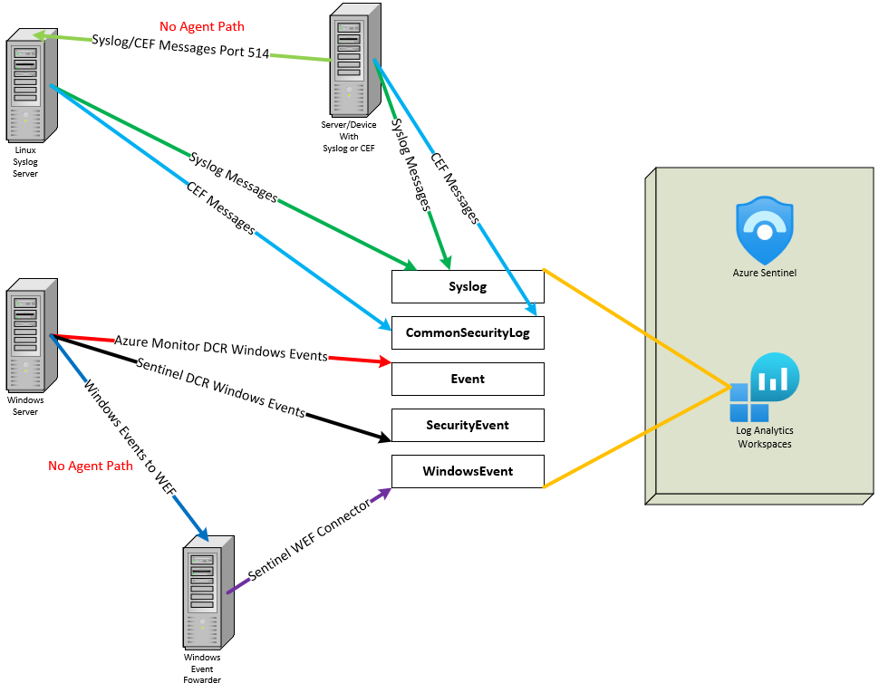 Now, let's shift our focus to Windows Events from Windows devices. The method you choose for collecting these events determines where they are stored. If you use a Windows Event Forwarder, the events will be sent to the WindowsEvent table. On the other hand, if the events are collected through a Data Collection Rule (DCR) created via Azure Monitor, they'll end up in the Event table. Lastly, if the DCR is established using the Sentinel connector, the events will be directed to the SecurityEvent table.