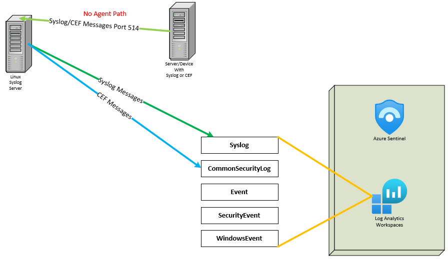 If you prefer not to install the Azure ARC agent and its AMA extension on all your servers, or if you have devices capable of exporting Syslog, opting for a Syslog forwarder is a good choice. This forwarder operates on the standard TCP/UDP port 514 for syslog. It then utilizes Azure ARC and AMA to transmit the events to the Log Analytics Workspace over the secure TCP port 443. This is done using the "Common Event Format (CEF) via AMA" connector, a native feature of Microsoft Sentinel. The message format you send determines its destination table: CEF-formatted messages land in the CommonSecurityLog table, while Syslog or unrecognized formats end up in the Syslog table.