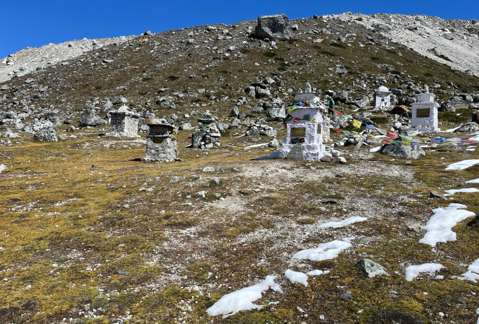 From there, we faced a different kind of climb for about an hour, leading us to the Everest Memorial Chukpi Lhara. This somber place is filled with memorials to those who have lost their lives on Everest. We spent some time walking around, reading the tributes, and reflecting on the bravery and sacrifice of these climbers.
