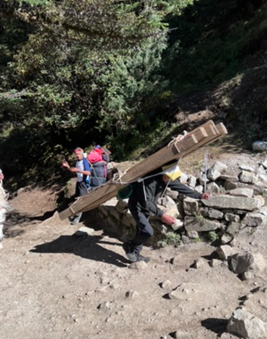 We had breakfast at 7:00 AM and set off around 7:45 AM. After a short trek downhill, we crossed another suspension bridge over the Dudh Koshi, aptly named the "milk river." Then the real climb began. Bibek assured us it would take no more than two hours. We managed it in about an hour and a half, passing several porters along the way, each carrying 60-kilo loads of wood. We later learned they were delivering supplies for a new tea house being built at the top.