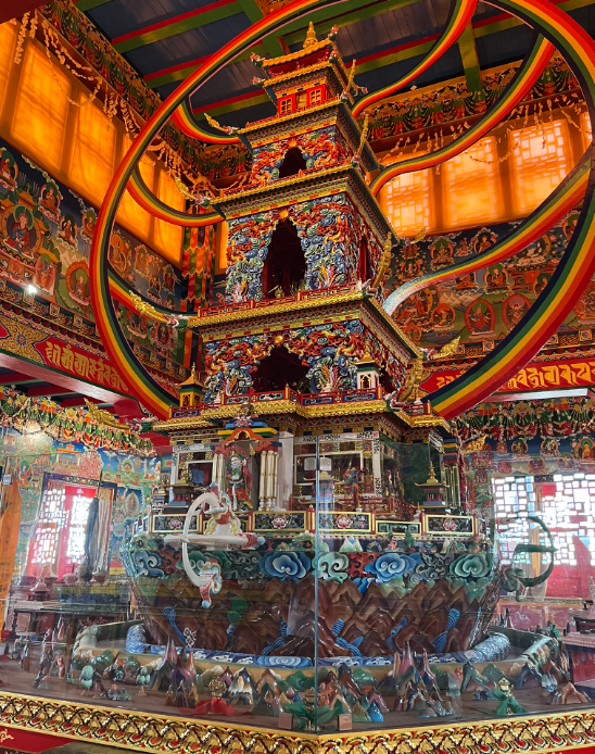Reaching the top, we arrived at the Tengboche Monastery, home to 55 Buddhist monks. This was an incredible experience. We prayed with one of the monks, who blessed us with red string necklaces, placing them around our necks. We were instructed not to shower with them on. He also blessed four more necklaces—one for Alicia's sister, two for my daughters, and one for my father. Although we couldn't take pictures inside the room with the large Buddha, the beauty of the space was unforgettable. We did get to take pictures in another room adorned with amazing Hindu art.