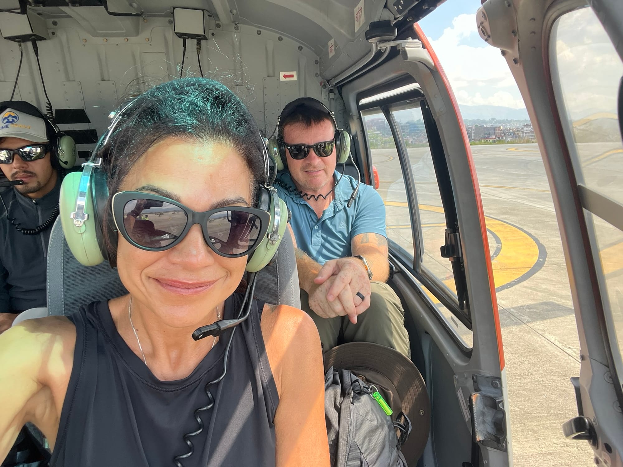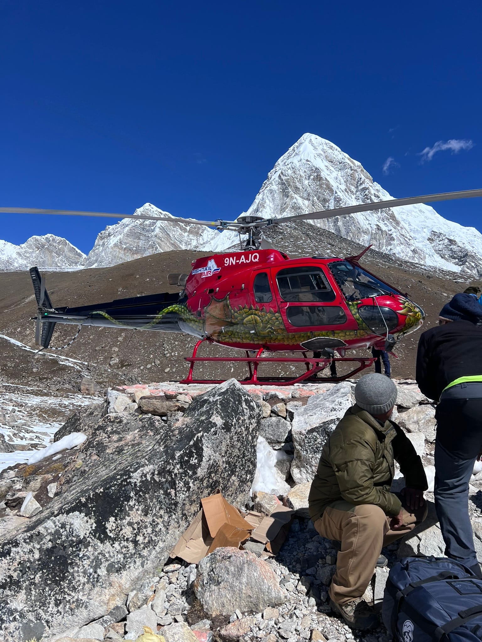 Now came the hard part—getting back. Due to poor visibility at Lukla, we faced a long wait to get a helicopter out of Gorak Shep. The helicopters could only carry two passengers at a time because of the elevation, so they would bring two down to Pheriche, add additional passengers, and then fly us back to Lukla. What took us nine days to climb only took 20 minutes to descend. It was fascinating to see the trail from above, spotting the tea houses and monasteries we had visited.