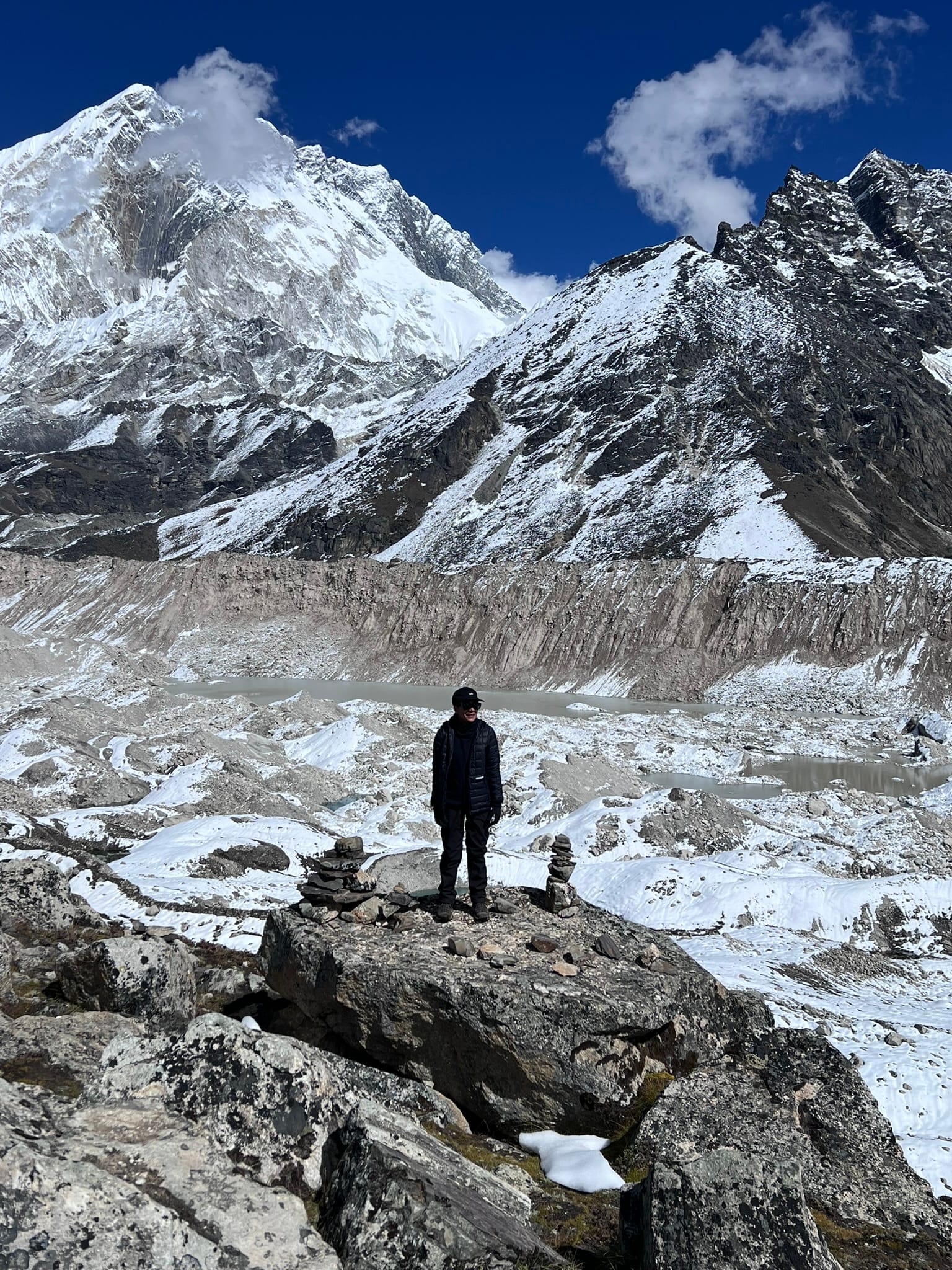 Upon reaching the village of Lobuche, we had lunch, dropped our stuff in our room, and then hiked to the Khumbu Glacier. Our guide, Bibek, informed us that it is the highest and largest glacier in the world. It was an awe-inspiring sight, and we could hear it moving—a series of cracks echoing down the path.