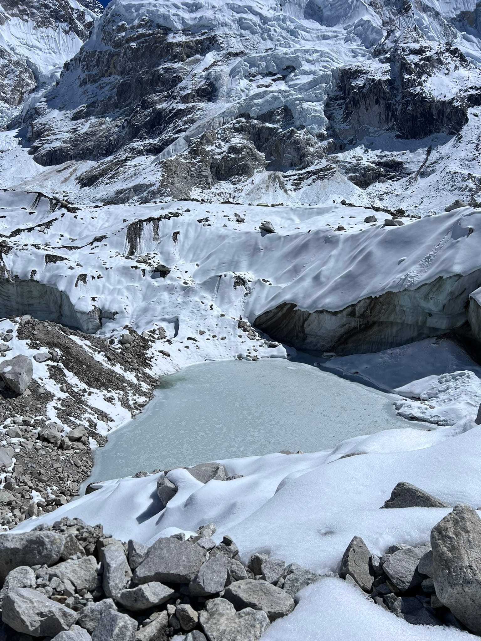 The views were astounding as we approached. We saw ice caves in the glacier and the ice flow coming down from the mountain pass. This is the treacherous path climbers must ascend to reach Camp One, fraught with crevasses that have claimed many lives.