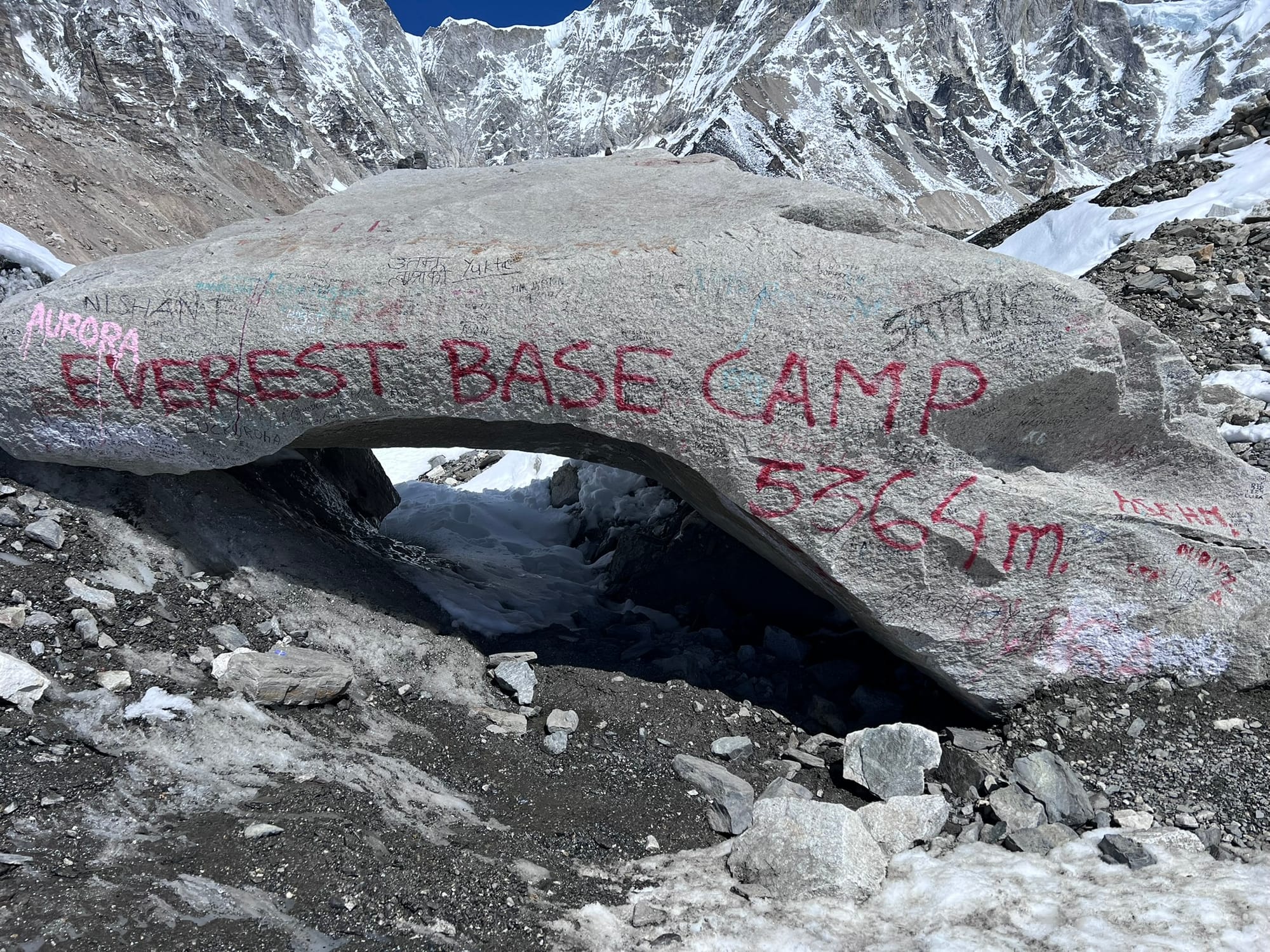 We stopped at the Snowland Hotel, our last house on the mountain, the highest and coldest. We had some tea since it was too early for lunch, and then set off for EBC. Our excitement was palpable. Bibek told us it would be another steady uphill climb, taking about 2.5 hours. He was spot on, having gauged our pace perfectly. About 20 minutes from EBC, we could see it. There were tents set up for those planning to stay the night. We were actually higher than EBC, looking down on it.