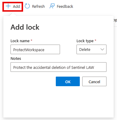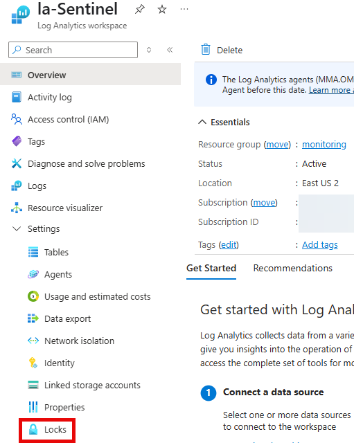 One of the most effective safeguards against accidental deletion is to apply an Azure Resource Lock on the Log Analytics workspace (or its resource group). Azure resource locks come in two levels: CanNotDelete (Delete lock) and ReadOnly. For our purpose, a CanNotDelete lock is ideal: