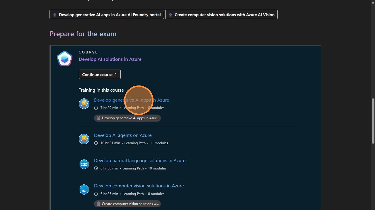 16. Scroll back up to "Prepare for the exam". For each "Training in this course", Right-click > Copy Link.