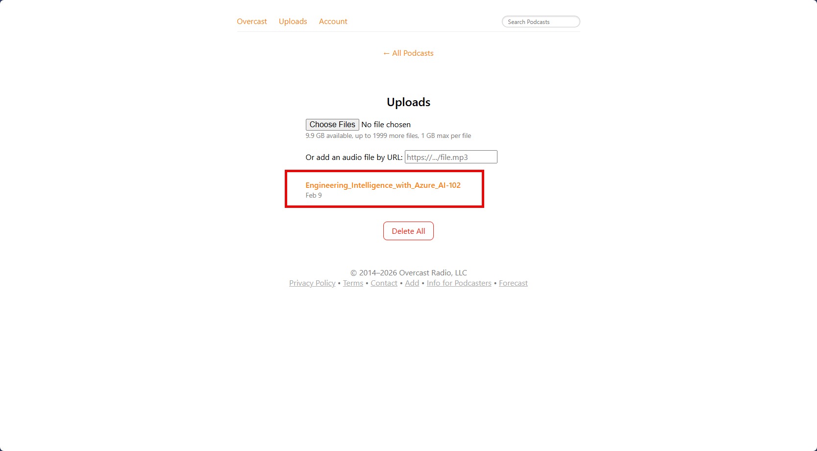 37. In a new tab, navigate to https://overcast.fm/ This the podcast software I use on my phone. The paid version allows for uploading audio files.